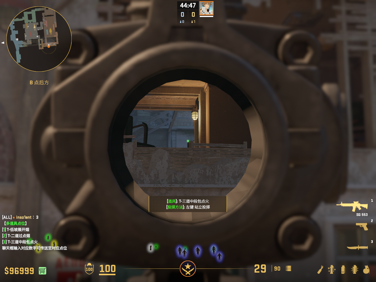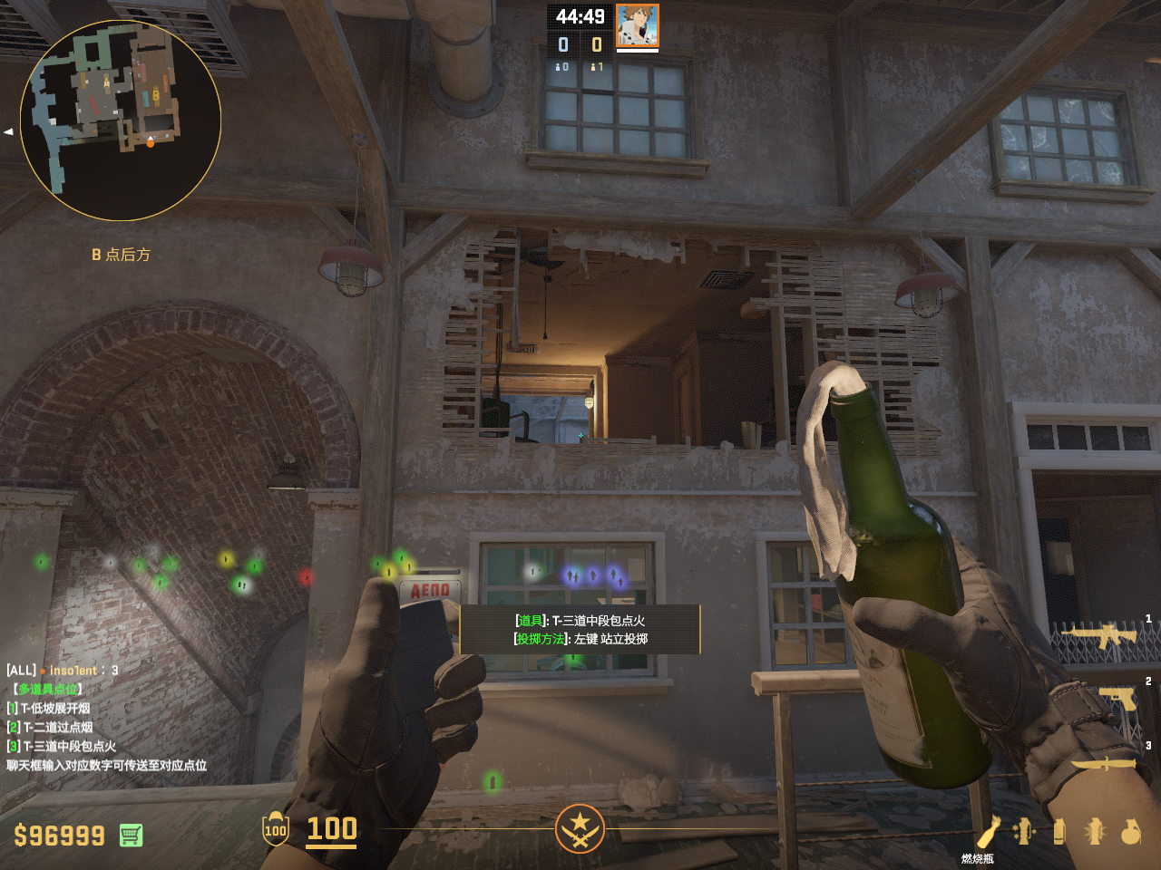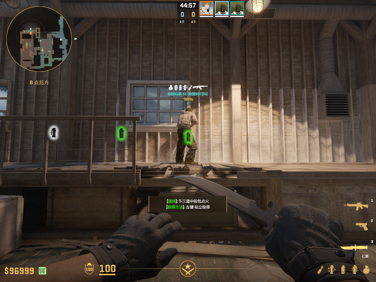 燃烧b包点,逼走b包点敌人,帮助队友进攻,或者下此处包区b2楼听见拆包声丢火