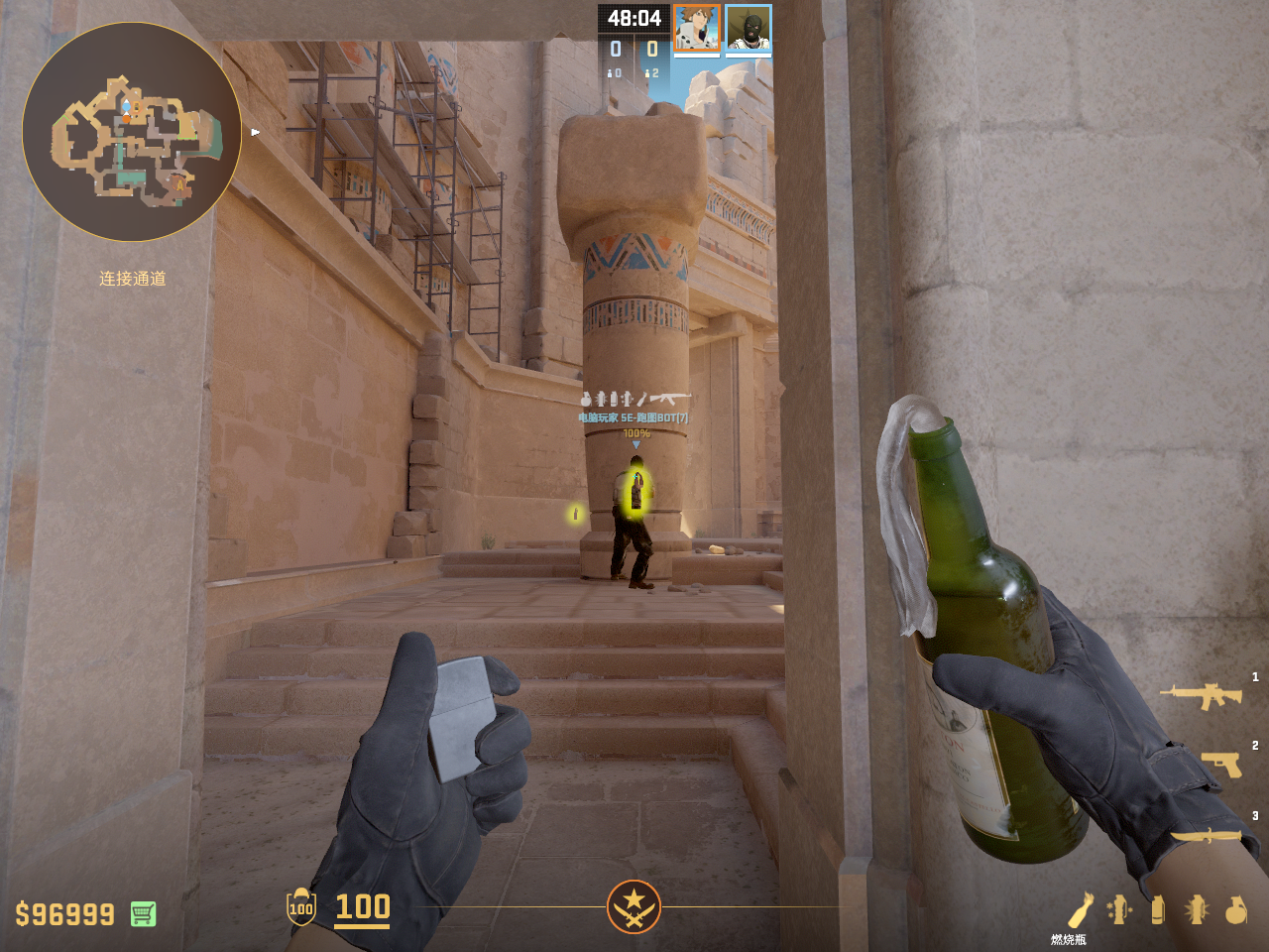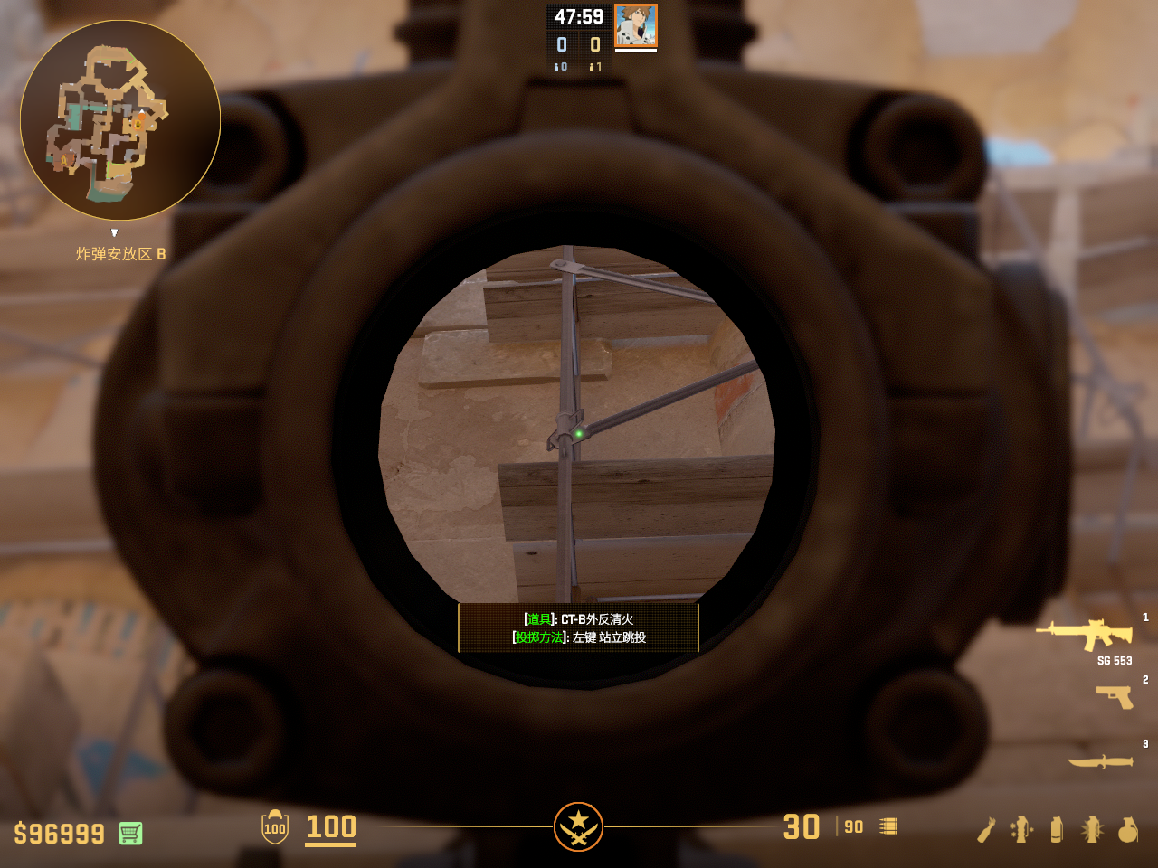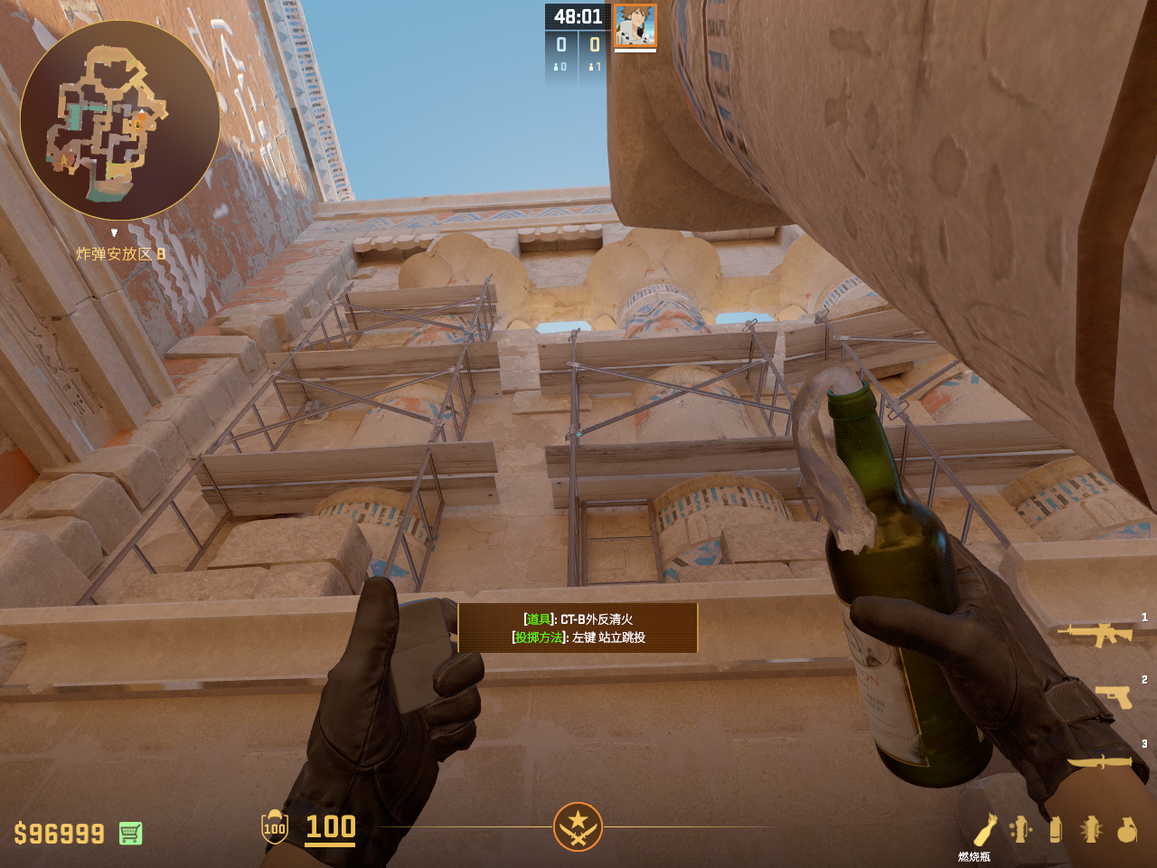 在A外二楼常规爆弹烧缺口的火 容错较高 走一步丢即可